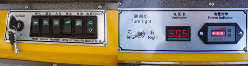 1、中英文儀表臺(tái) 2、電壓表、電量表、轉(zhuǎn)向燈 3、邊刷防裝裝置 4、后視鏡